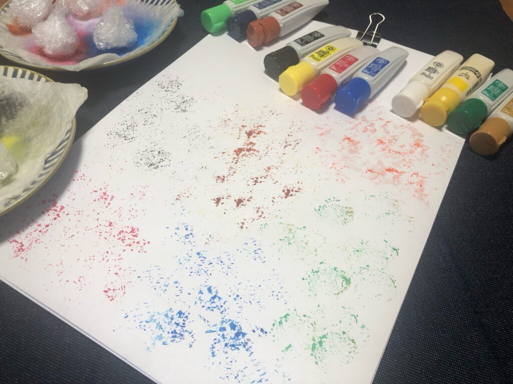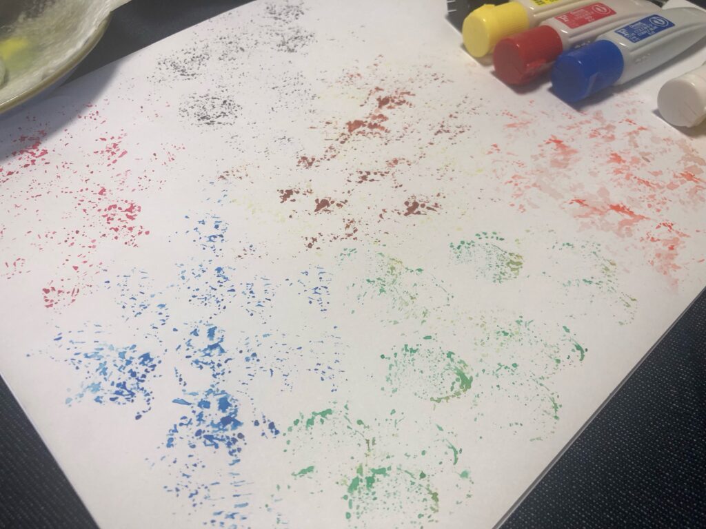 今回紹介したやり方だと、ブラシを使うスパッタリングよりも汚れる心配が少ないですし、絵の具ひっくり返したりしても、キッチンペーパーをかぶせているので安心です。笑