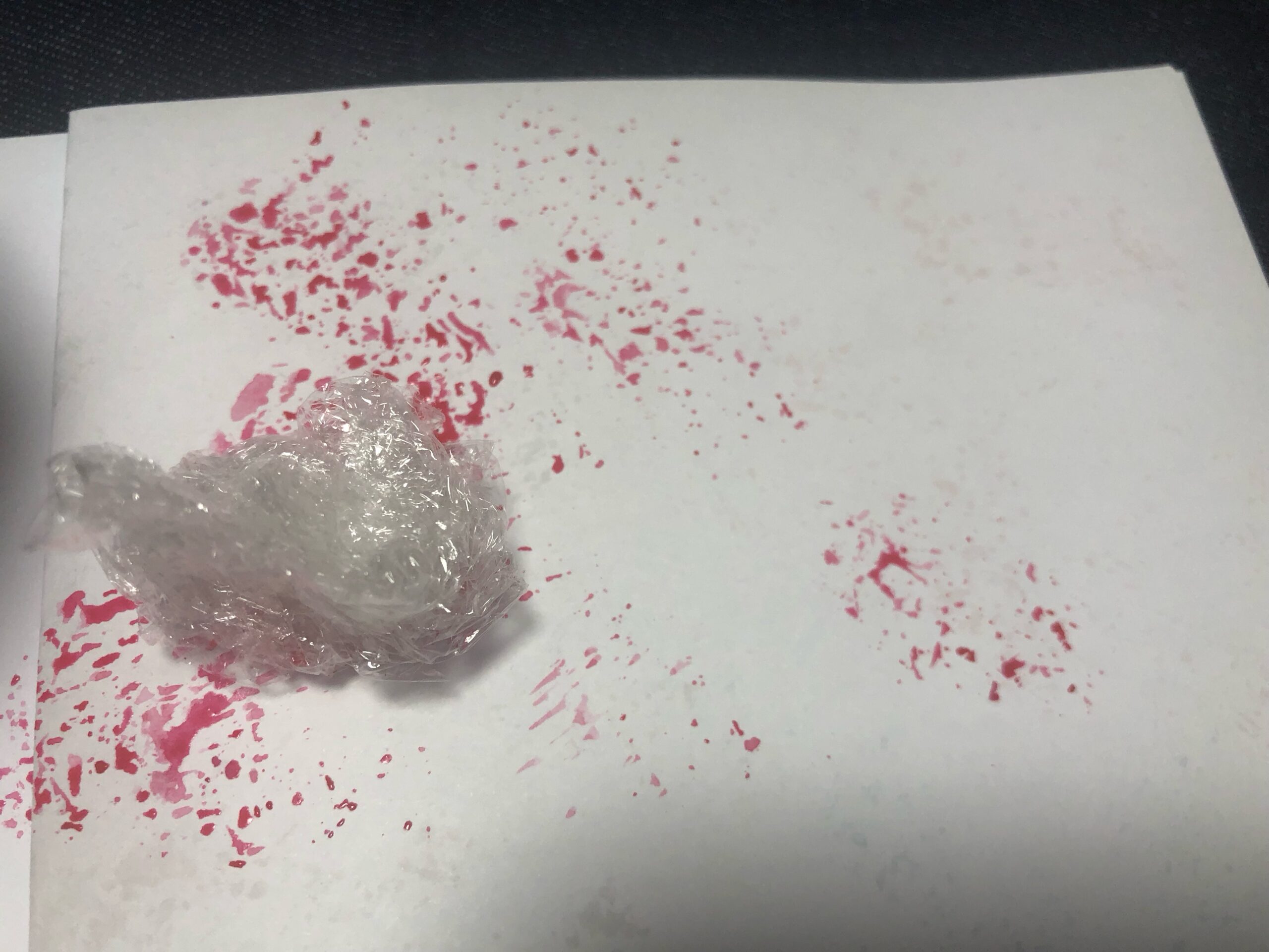④丸めたラップに絵の具を付けて画用紙にスタンプします。(きれいなスパッタリングもどきができます)