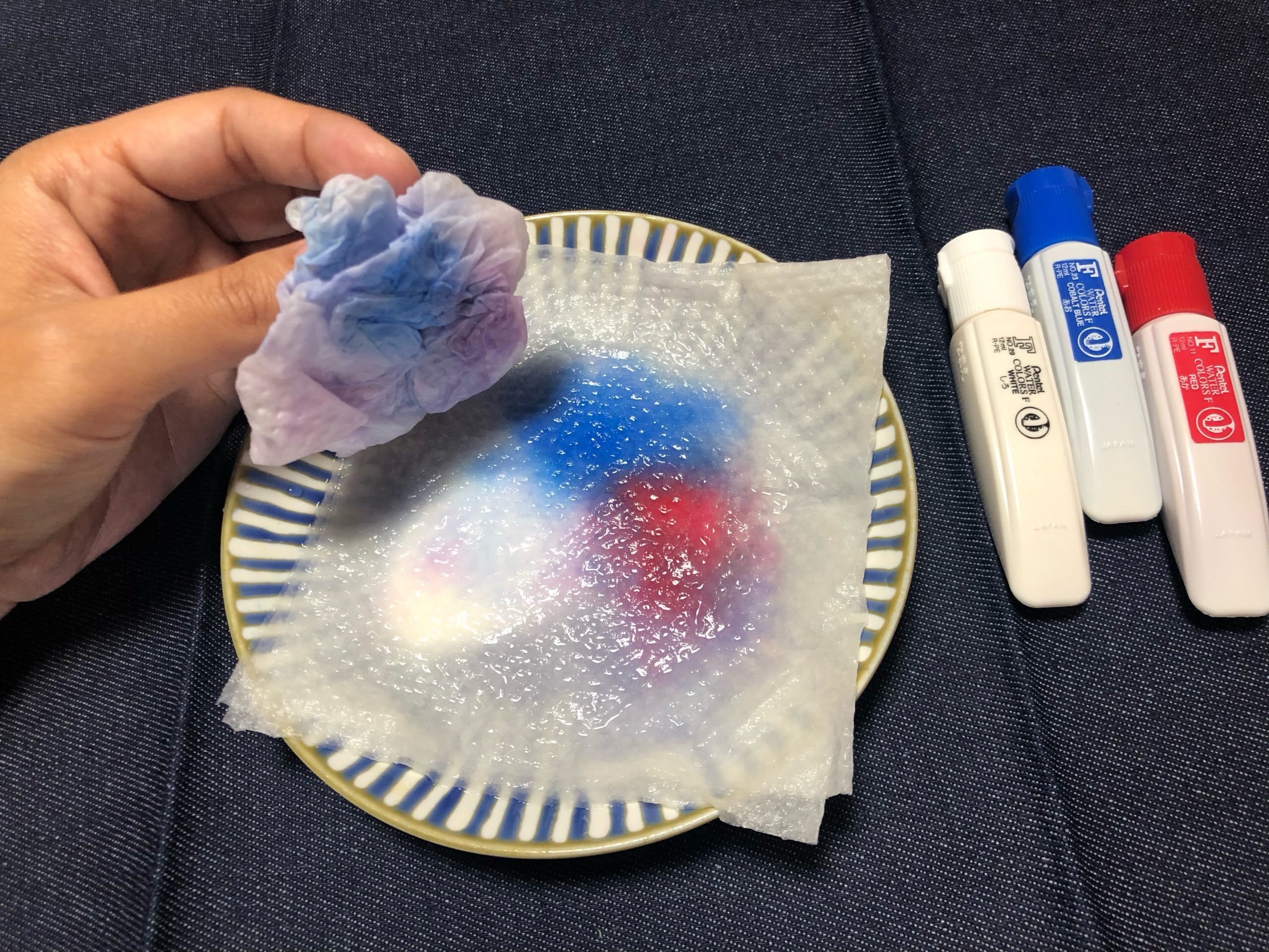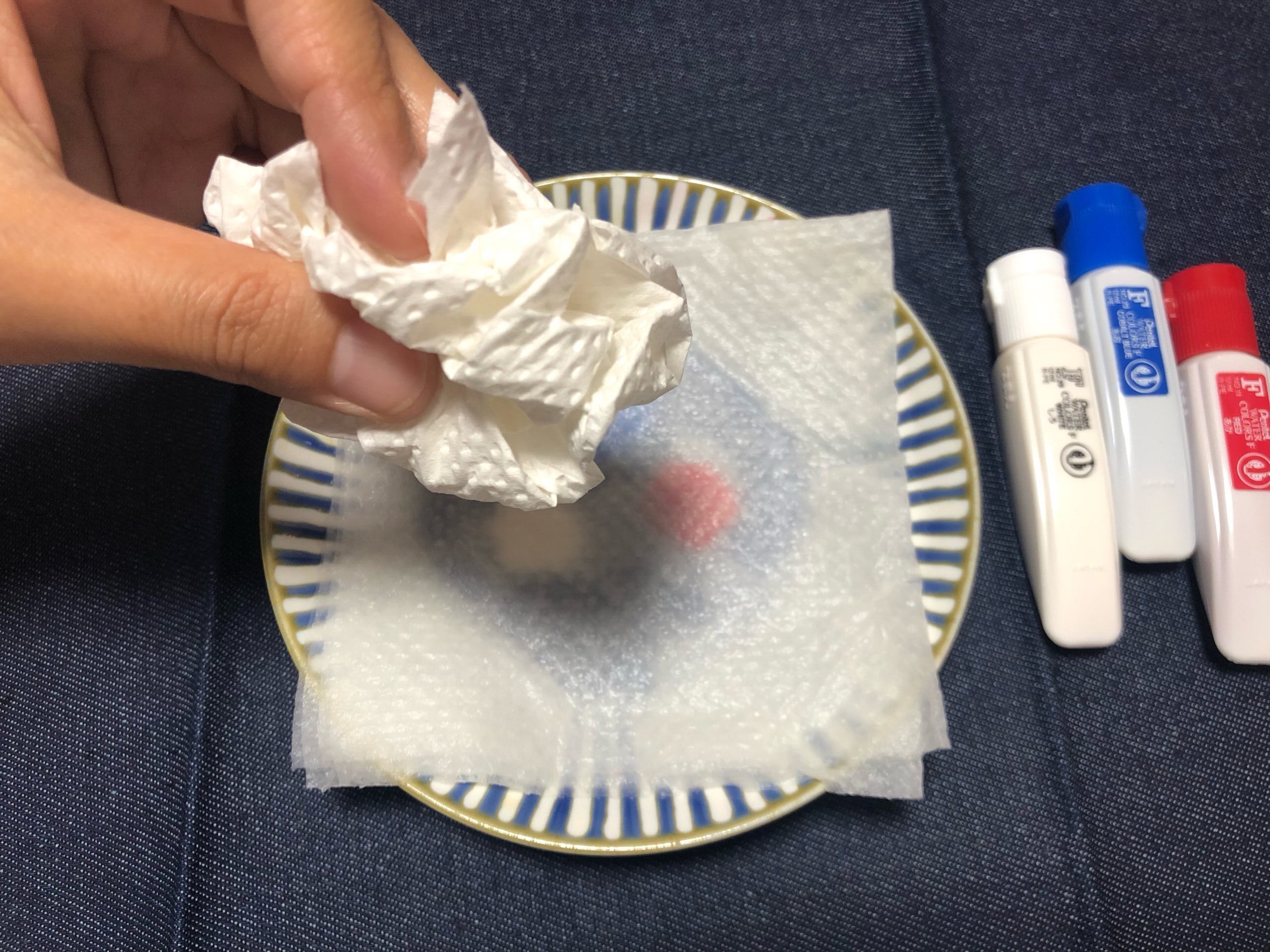 ➁濡れたキッチンペーパーを絵具の上にかぶせます。