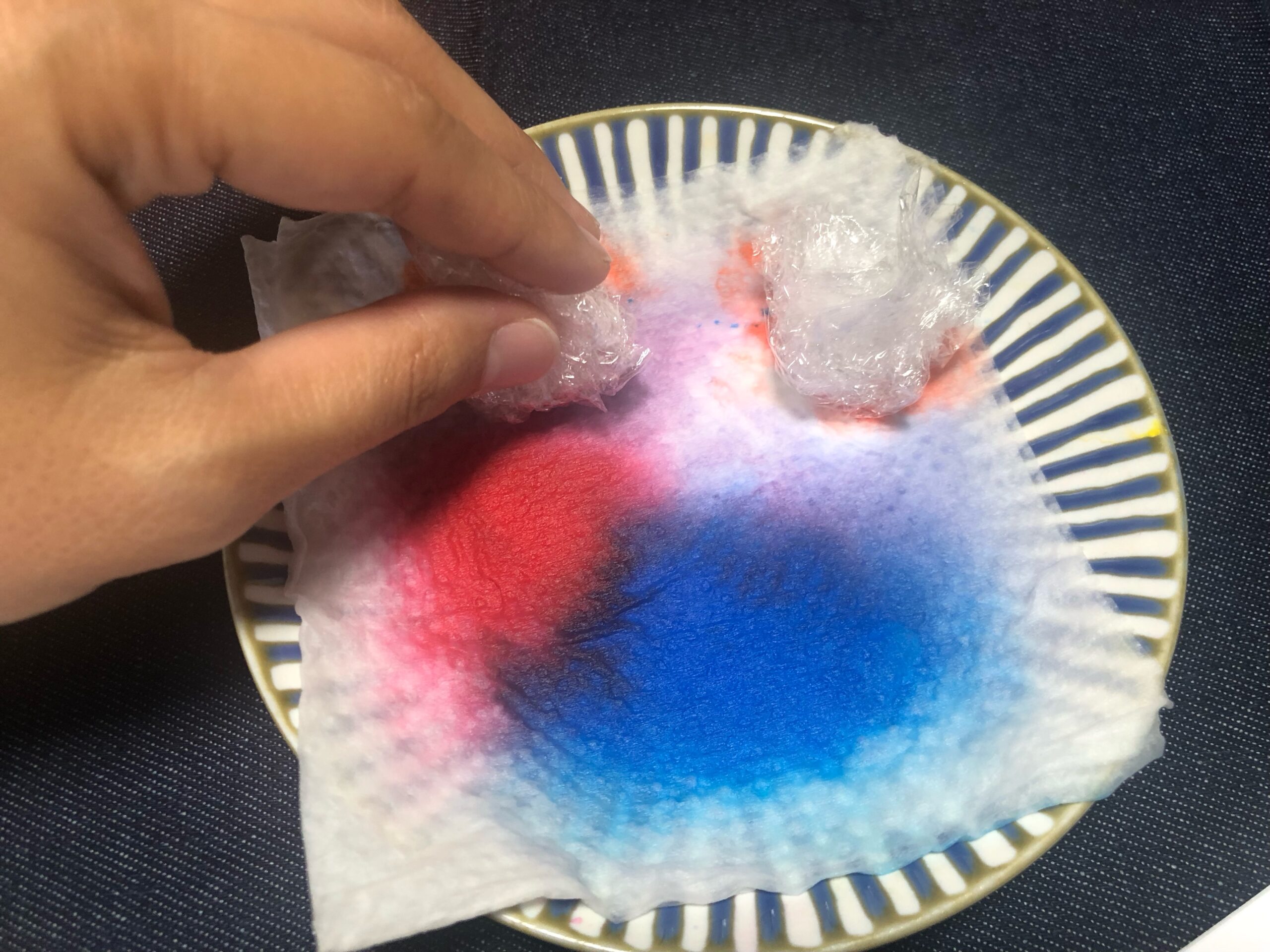 ③新しいキッチンペーパーでお皿の絵の具をにじませます。(色がにじみにくい場合は、水を足してください)