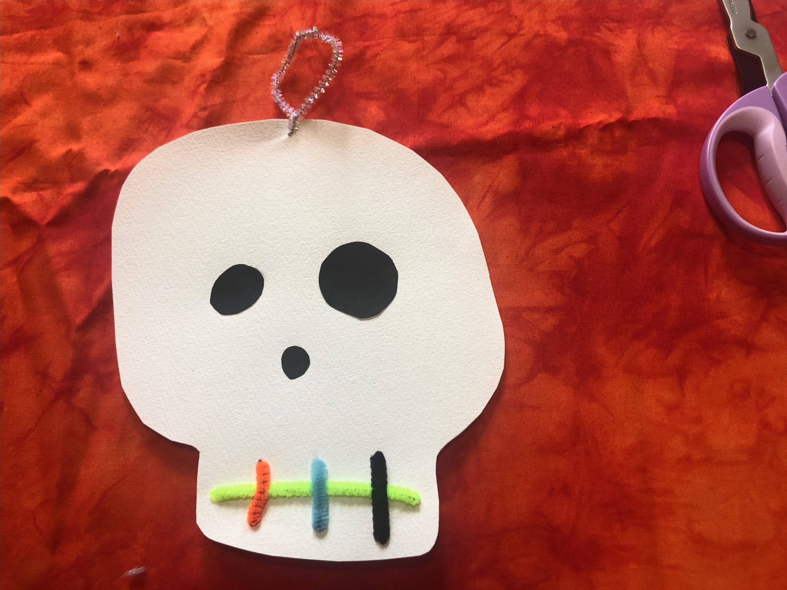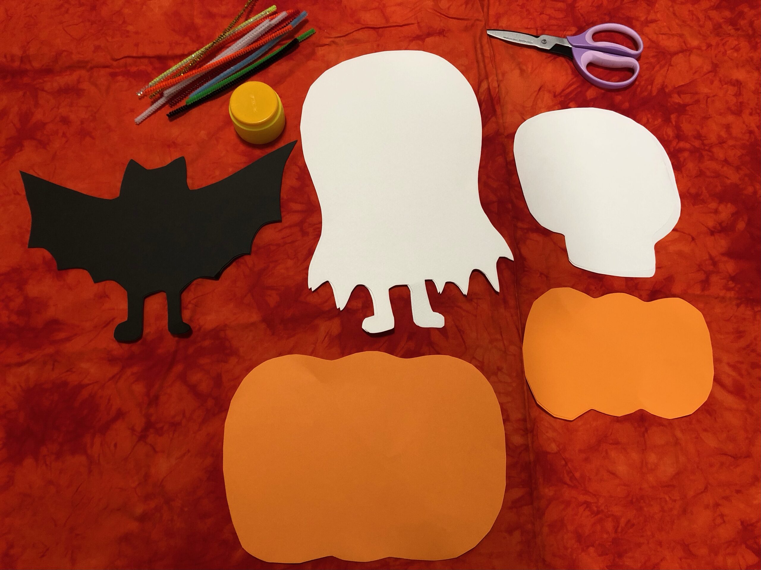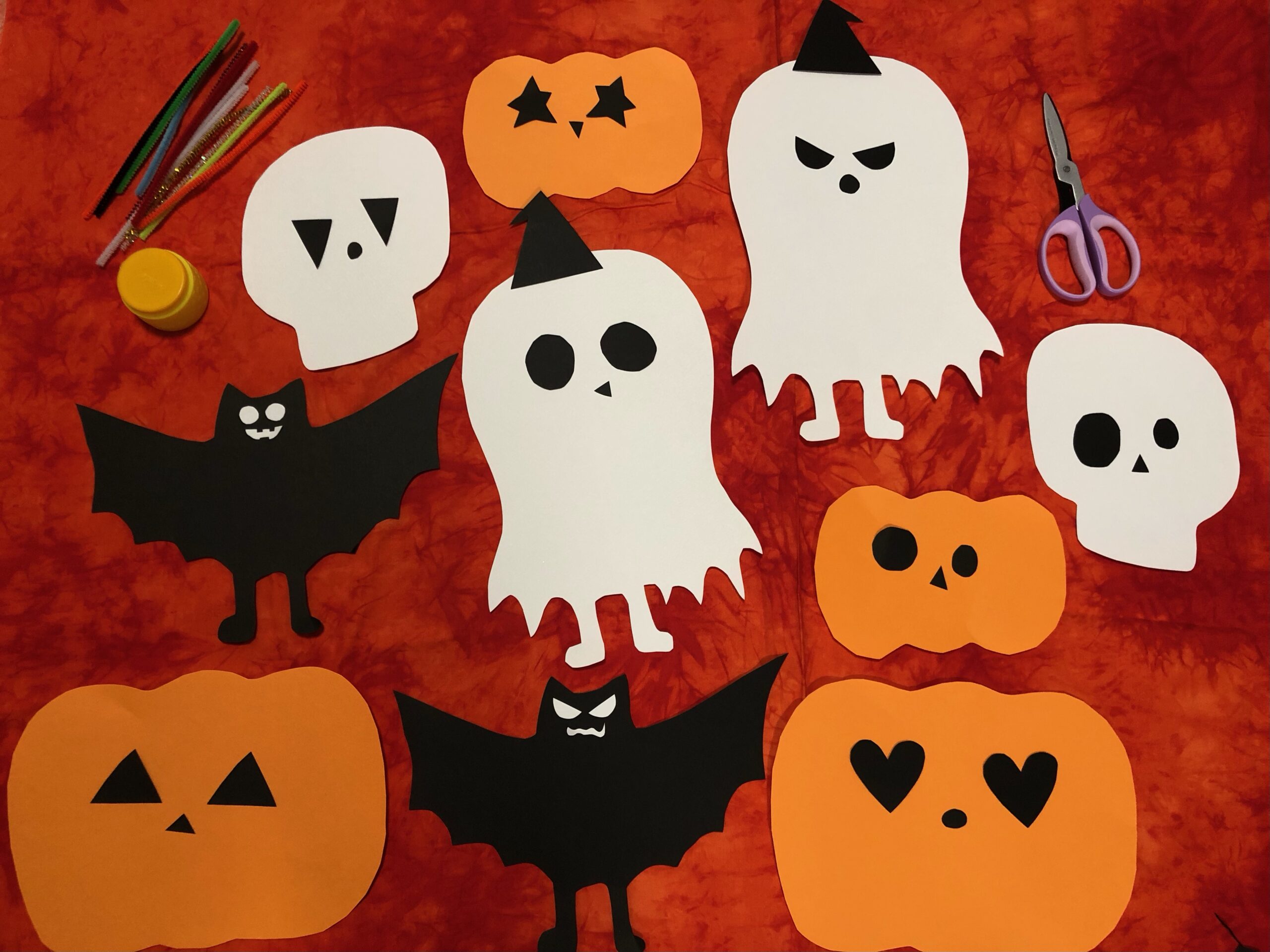 ①画用紙をパンプキン、おばけ、こうもり、がいこつなどのシルエットに切ります。